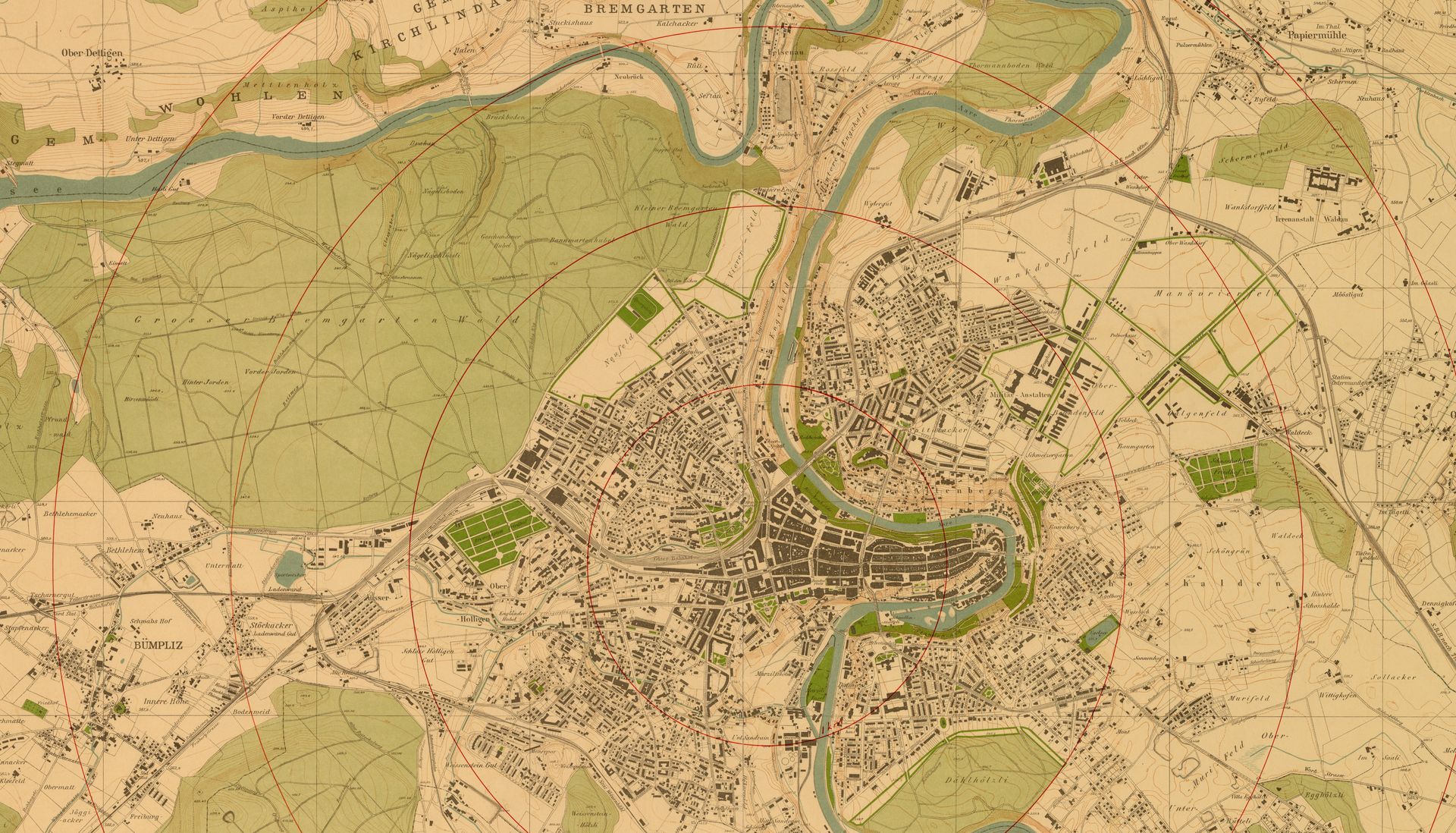 Seit der Gründung der Stadt Bern 1191 hat sich das Siedlungsgebiet immer wieder erweitert. War es bis in 19. Jahrhundert auf die Aareschlaufe beschränkt, entstand mit der Fertigstellung der ersten Eisenbahnbrücke 1858 in der Lorraine ein Arbeiterviertel. Durch den Bau der Kirchenfeldbrücke 1883 und der Kornhausbrücke 1898 konnte sich das Siedlungsgebiet weiter entwickeln. Mit der Eingemeindung von Bümpliz 1919 wurde die Stadt in Richtung Westen vergrössert. In den Plänen der Stadt ist dieser Wandel erkennbar.
